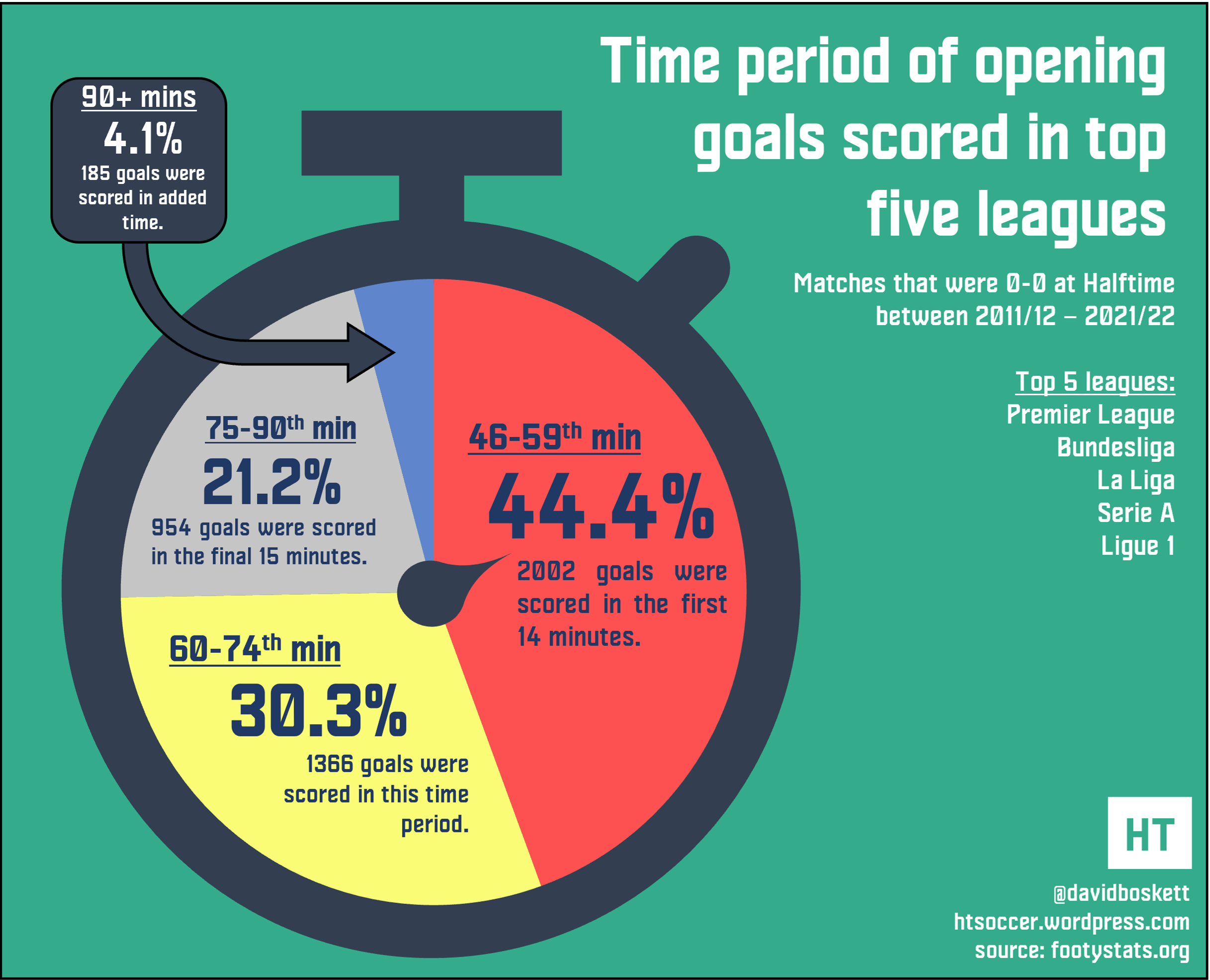 In fact, during the most recent game I watched before publishing this article – Chelsea vs Manchester City – Riyad Mahrez scored in the 63rd minute, one minute before the Premier League’s average for opening goals in the second half. This goal was particularly satisfying as it reinforced my findings that the first 25 minutes of the second half is when most goals occur.