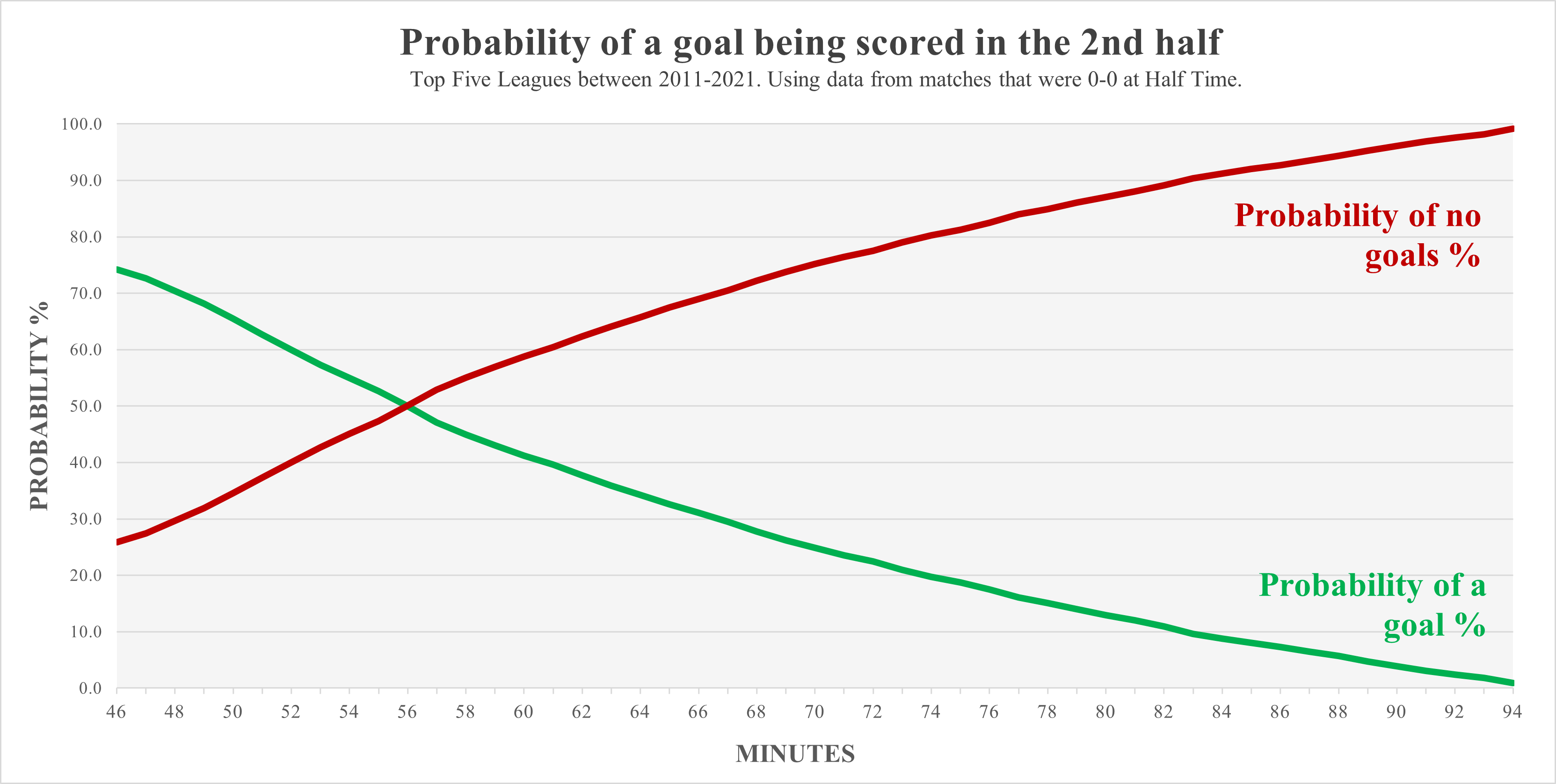 NOTE: Try not to confuse this probability with the above data visualisation which only measures what time goals are scored in matches where they are scored.