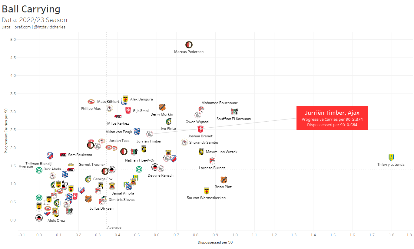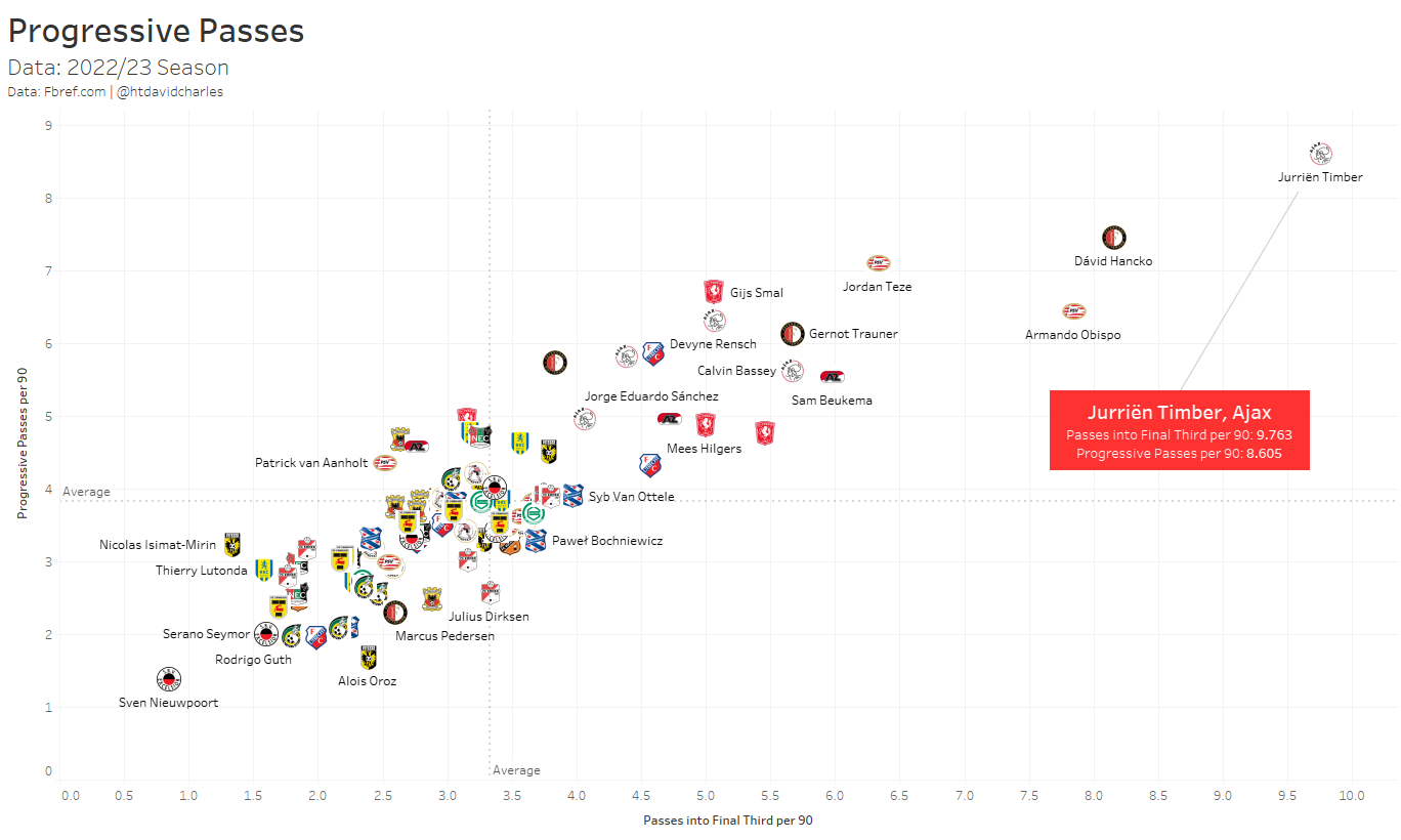 Once again, Timber stands out as a clear outlier in his ability to progress the ball from the back line. This remarkable skill further enhances the significance of his high pass completion rate, considering the inherent risk involved in attempting more ambitious passes.