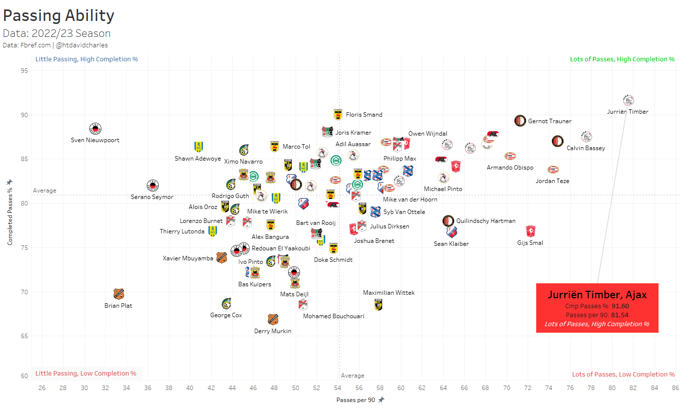 Timber showcases exceptional proficiency as a passer of the ball. Notably, he registered the highest number of passes among all defenders in the Eredivisie.