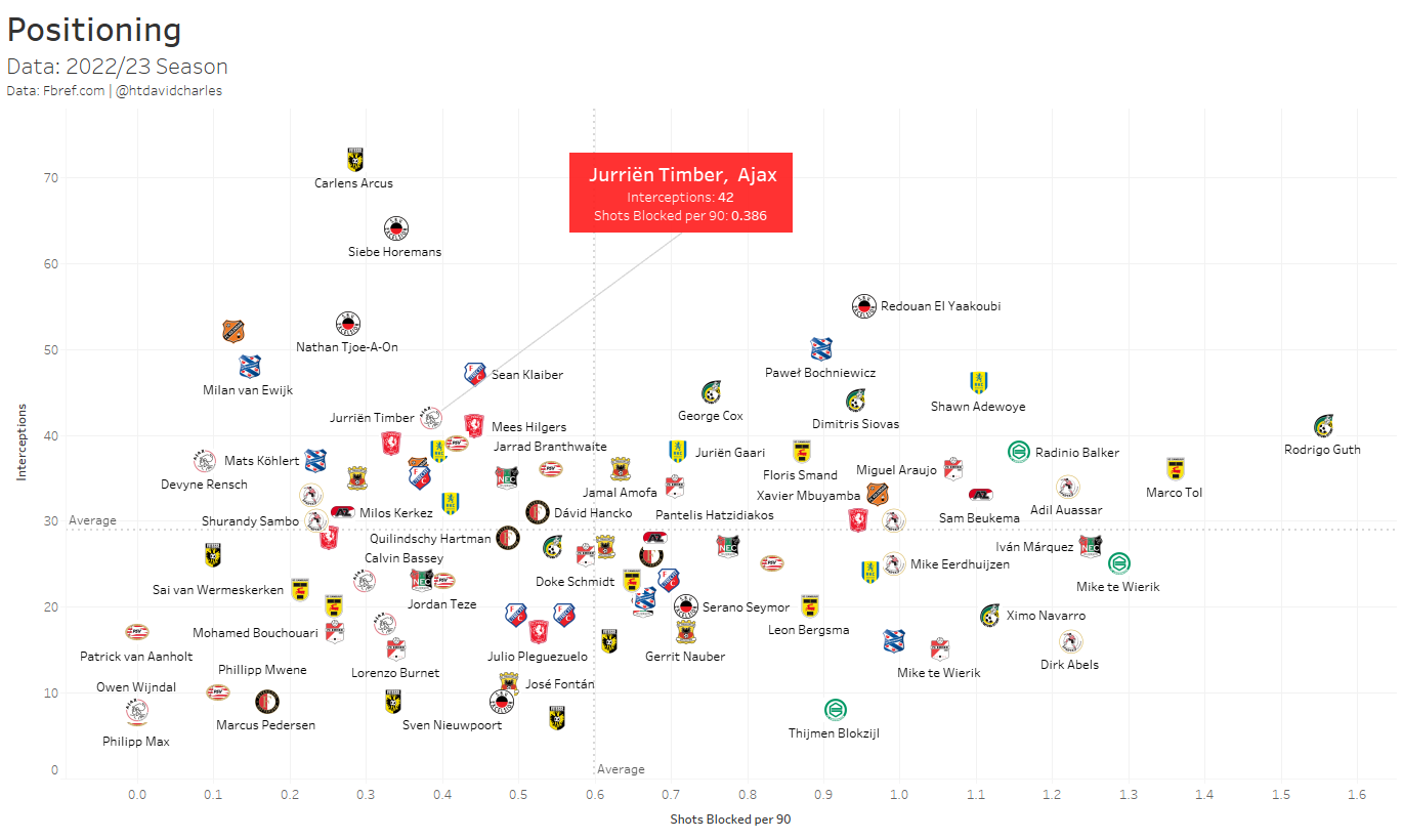 During the 2022/23 season, Timber recorded an impressive 42 interceptions, averaging 1.2 per game. This figure surpasses the league average of 29 interceptions, highlighting his ability to read and disrupt the opposition’s play effectively. Additionally, he blocked fewer shots on goal compared to the league average (Timber: 0.38, Eredivisie Average: 0.59).