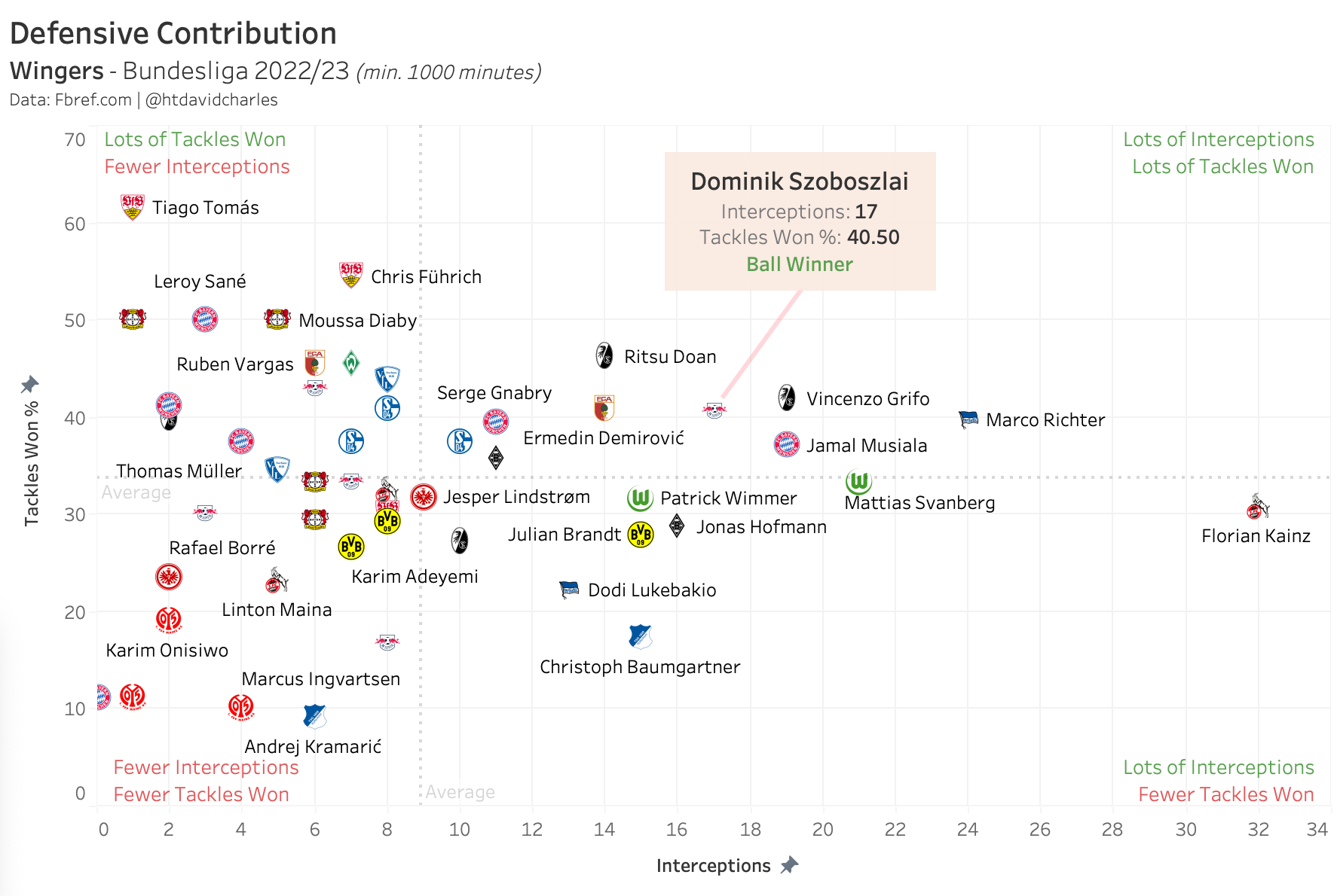 Szoboszlai’s time at Leipzig showcased his ability to win tackles (0.625 per 90 minutes) and intercept passes (0.625 per 90 minutes), making him a reliable and versatile pressing asset on the pitch.