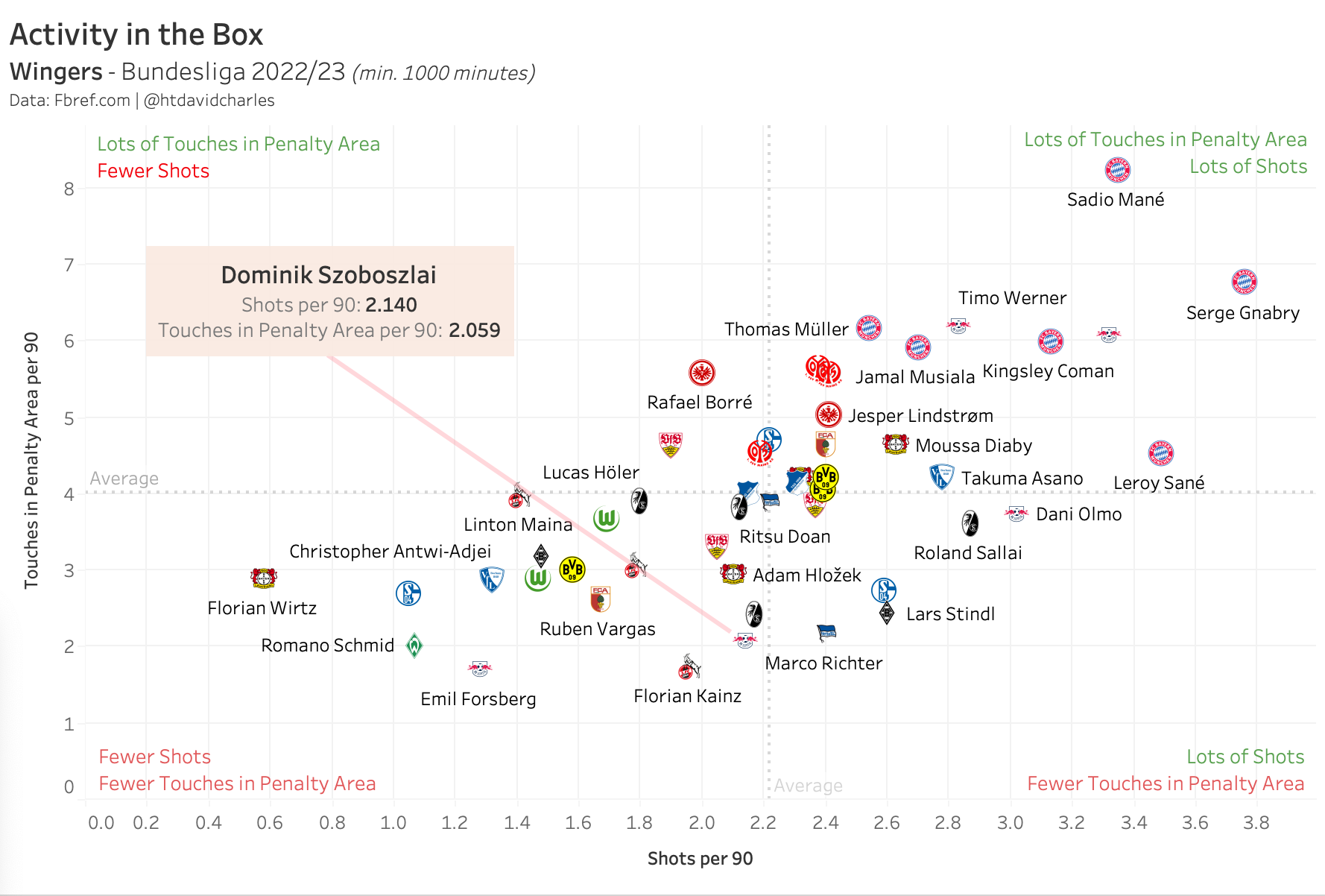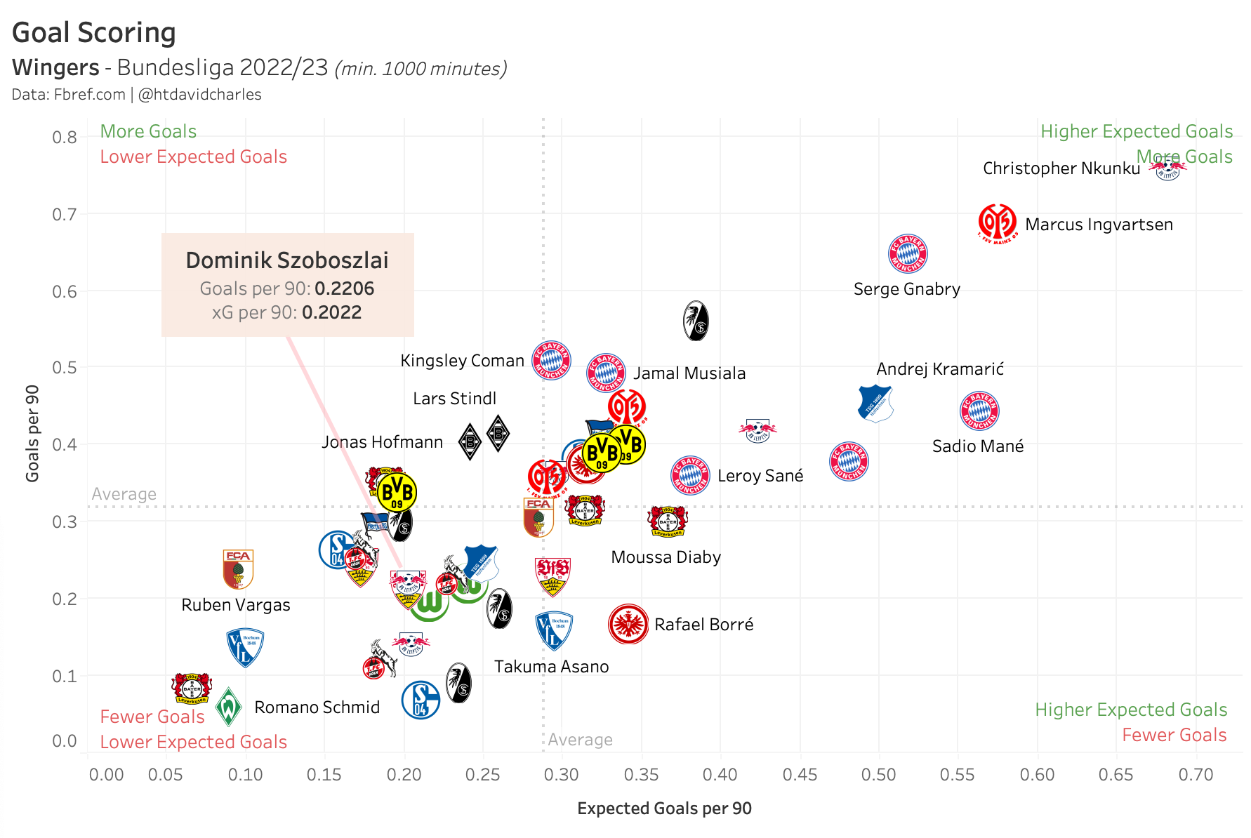 During the previous Bundesliga season, Szoboszlai managed to find the back of the net on 5 occasions, excluding penalty kicks, whilte having an non-penalty expected goal value of 4.7. Although his goal tally aligns closely with his expected figures, they appear relatively modest for an attacking midfielder.