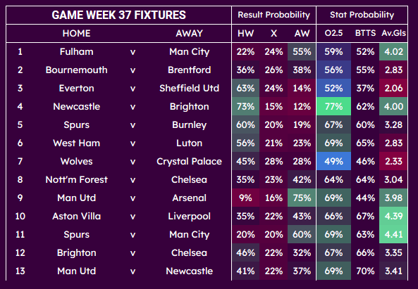 We went for a differential captaincy, and it didn’t pay off. From our captaincy options table in the original article, we chose the only player who didn’t return any goals or assists. Oh well, onto the final week..