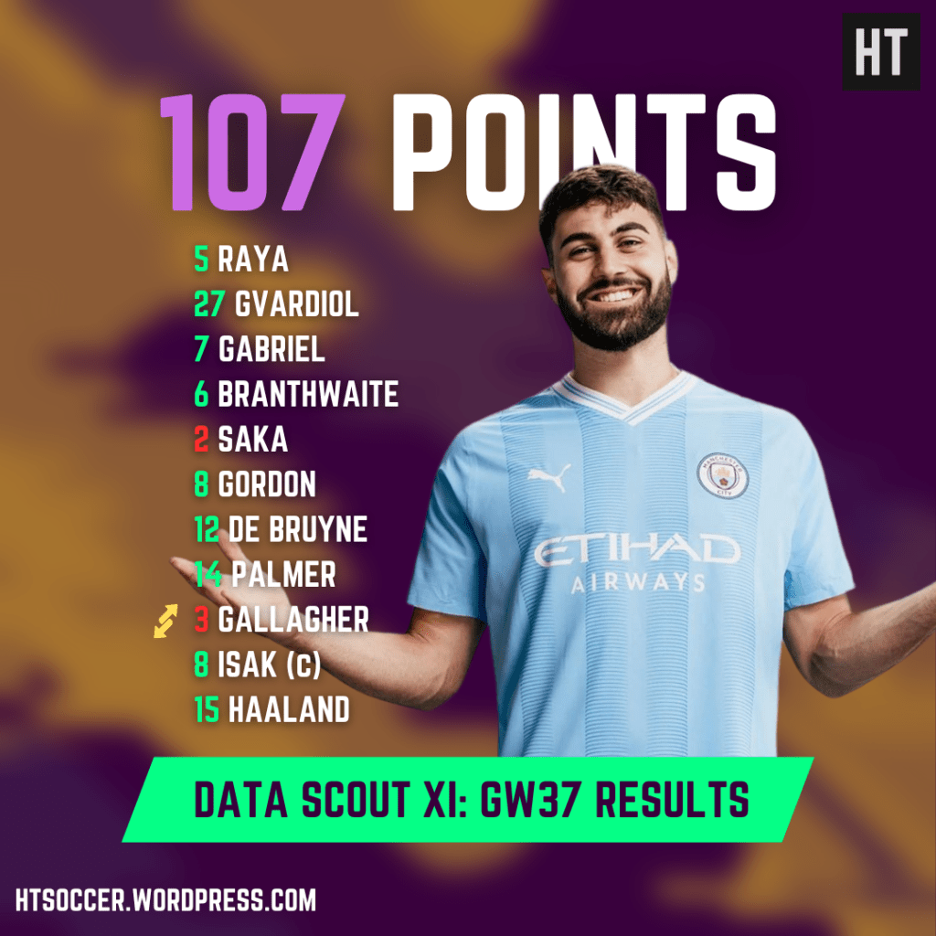 MID Points: 39. Saka was a gamble which didn’t pay off, Havertz or Trossard were our other options and they both scored points thanks to their work for the only goal in the game. Gordon failed to score points in his home match which is unlike him, however he did provide in the away fixture against Manchester United. De Bruyne kept up his terrific away form, scoring twelve points from two assists. Palmer was on the scoresheet once again against Brighton, as well as assisting against Forest. Gallagher came into our team as a replacement for Wilson who did not feature in either matches for Newcastle. He scored a disappointing three points.
